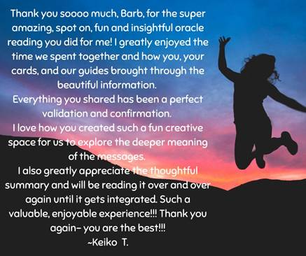 Barb’s oracle reading was so timely and beneficial in my life. She provided a reading to me via Skype (live online); and although I was not very familiar with Skype at the time, she made me feel very comfortable both before and during the call.