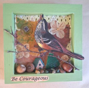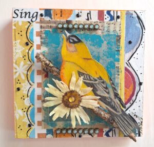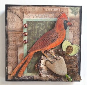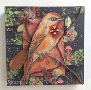 My mixed media dimensional Animal Art thoughtfully blends together chosen images of animals that have inspired and/or captured my attention in some way! Each image and corresponding backgrounds are enhanced with a variety of pastel chalks, pencils, markers, and paint. My collages include dried florals, leaves, and natural elements I discover on my walks such as acorns, feathers, stones, and tree branches, along with bits of discarded/recycled ephemera. Animal images and supporting images are then curated and adhered to create a dimensional effect that is gently and lovingly nestled with care onto various sized birchwood panels.
